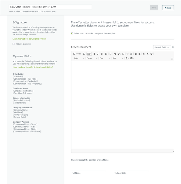 The final design concept was agreed upon after four rounds of feedback from both my PM and UX design team. We ensured the administrator could setup templates with dynamic fields, hiring managers could quickly create and send offers to their prospective hires, and the prospect could review and sign the offer from a secure link: